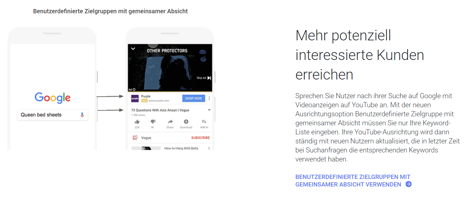 Mit TrueView for Action und benutzerdefinierten Zielgruppen können Marketer Personen auf YouTube erreichen, nachdem sie bei Google nach einem bestimmten Keyword gesucht haben.
