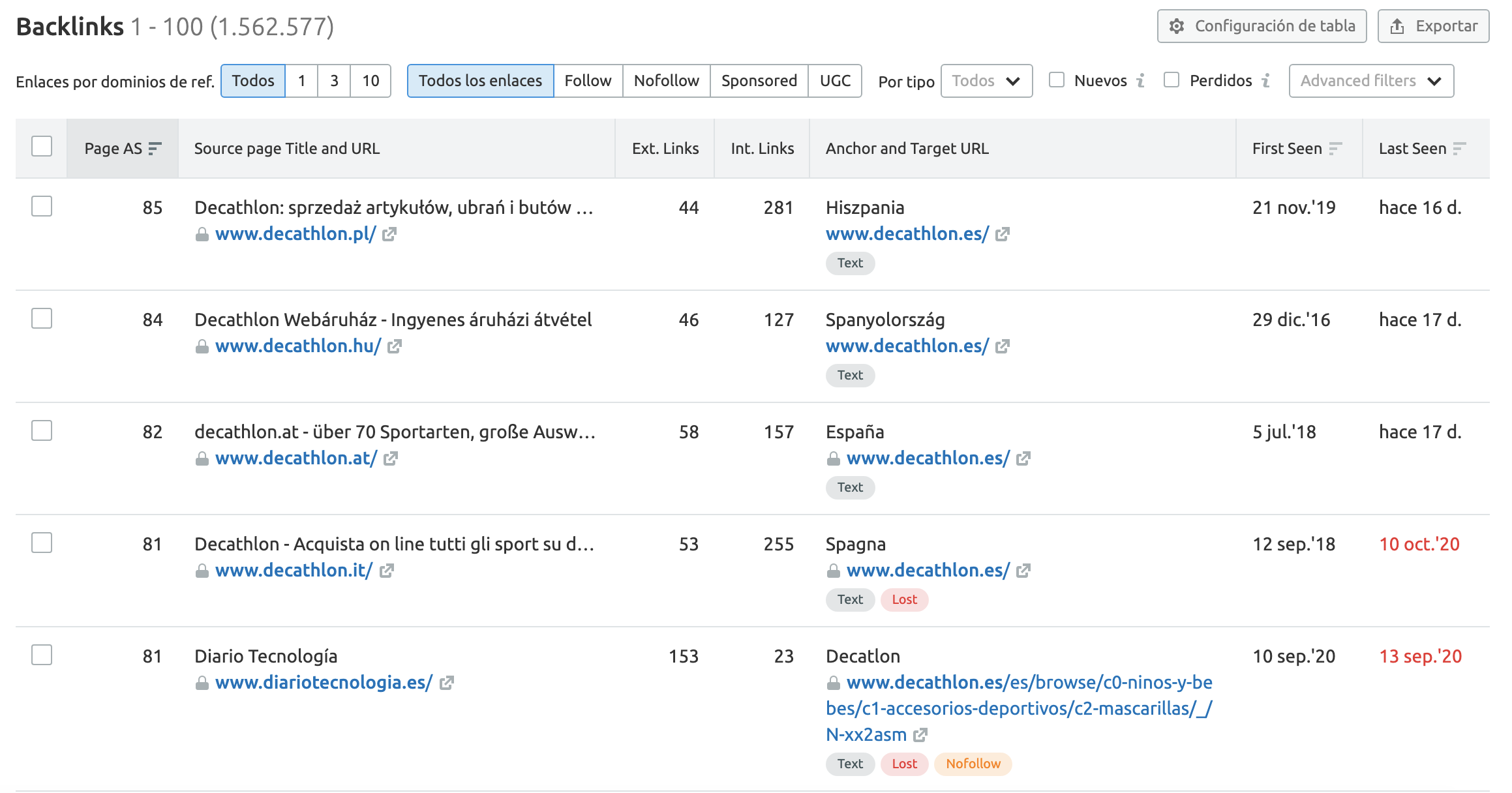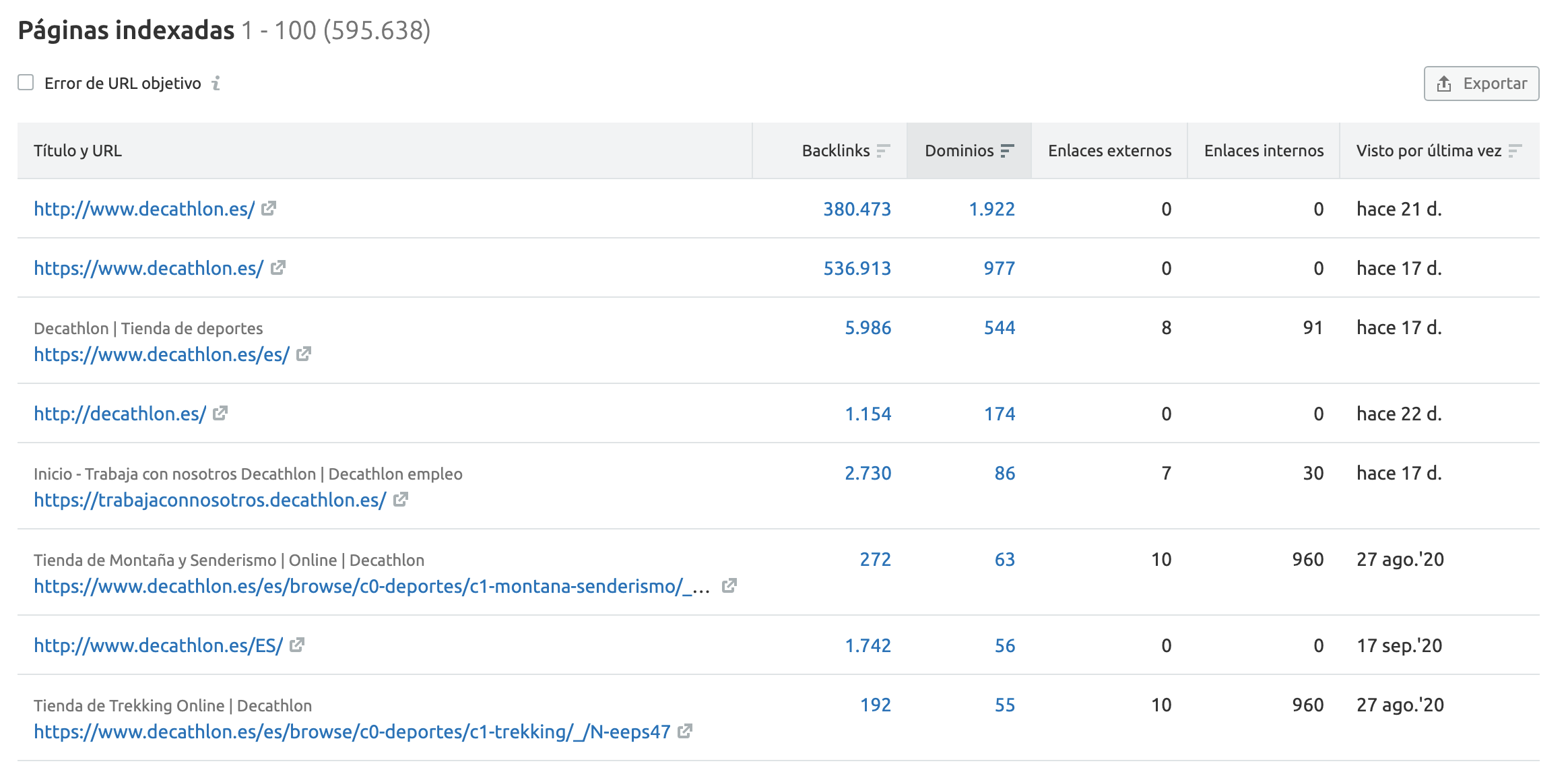 Para cada enlace, verás el anchor text utilizado y la URL objetivo. También la información de la primera y la última fecha visualizada. Puedes exportar estos datos como archivo .csv o documento excel con la caja de "exportar" en la parte derecha de tu página.