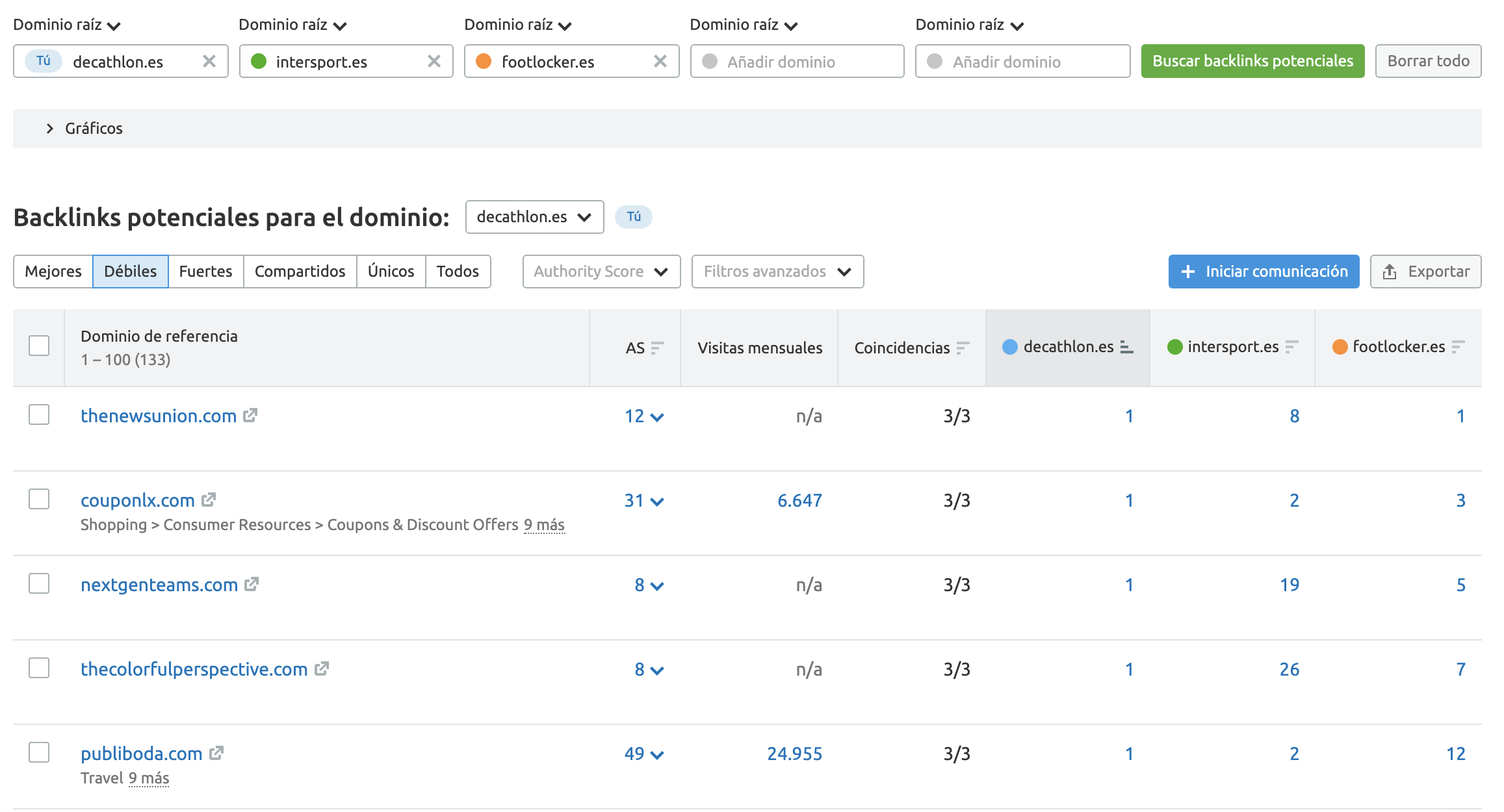 Puede ser increíblemente útil comparar tu dominio con respecto a otros competidores al mismo tiempo. De esa manera podrás visualizar las fortalezas y debilidades de cada uno.
