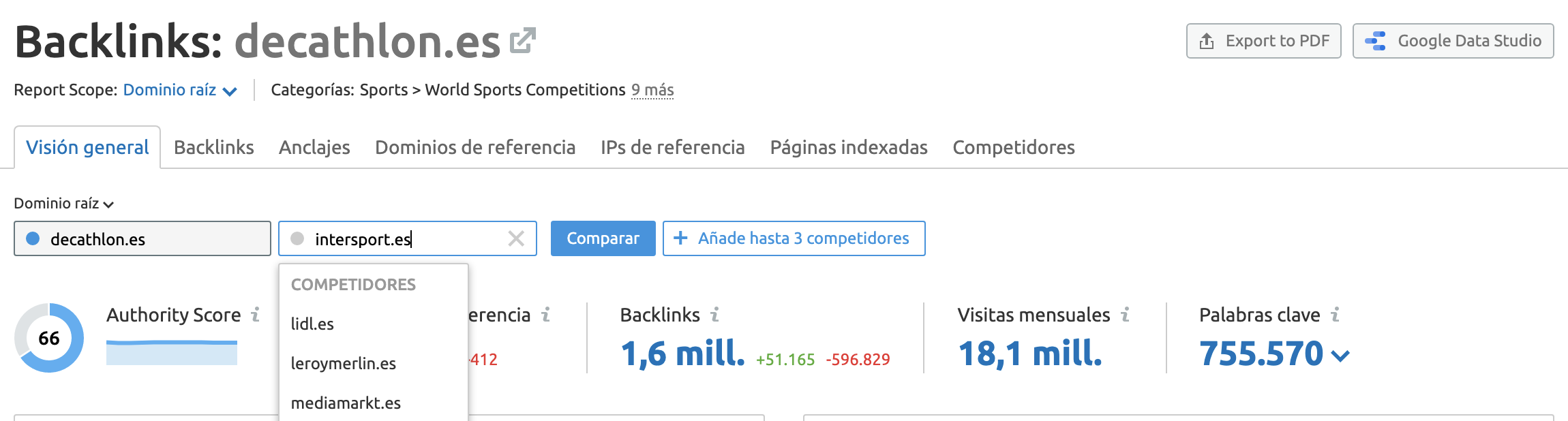 Si quieres una visión general rápida del perfil de backlinks, hay mucha información que puedes conseguir en un solo panel de control. Puedes además exportar la información como PDF o a Google Data Studio con el botón en la parte derecha de tu página.
