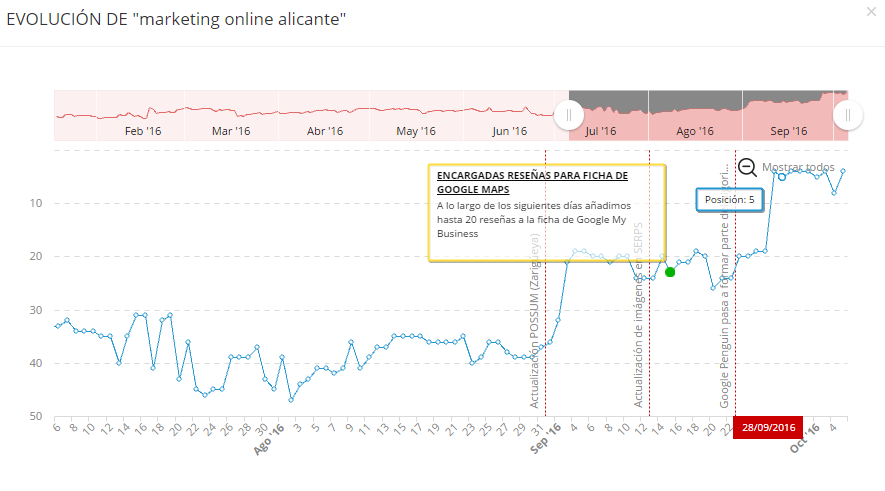 Con el paso de las semanas vas generando un mapa que te da una idea muy real de cuál es tu verdadera situación a nivel SEO por los criterios que más te interesan y a nivel local.