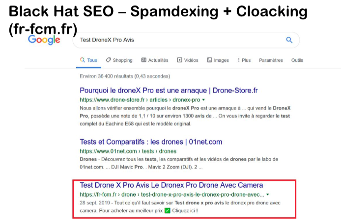 Le site fr-fcm.fr est très bien positionné sur la requête « Test DroneX Pro Avis ». Et pourtant, lorsqu’on clique dessus, on est redirigé sur un autre site.