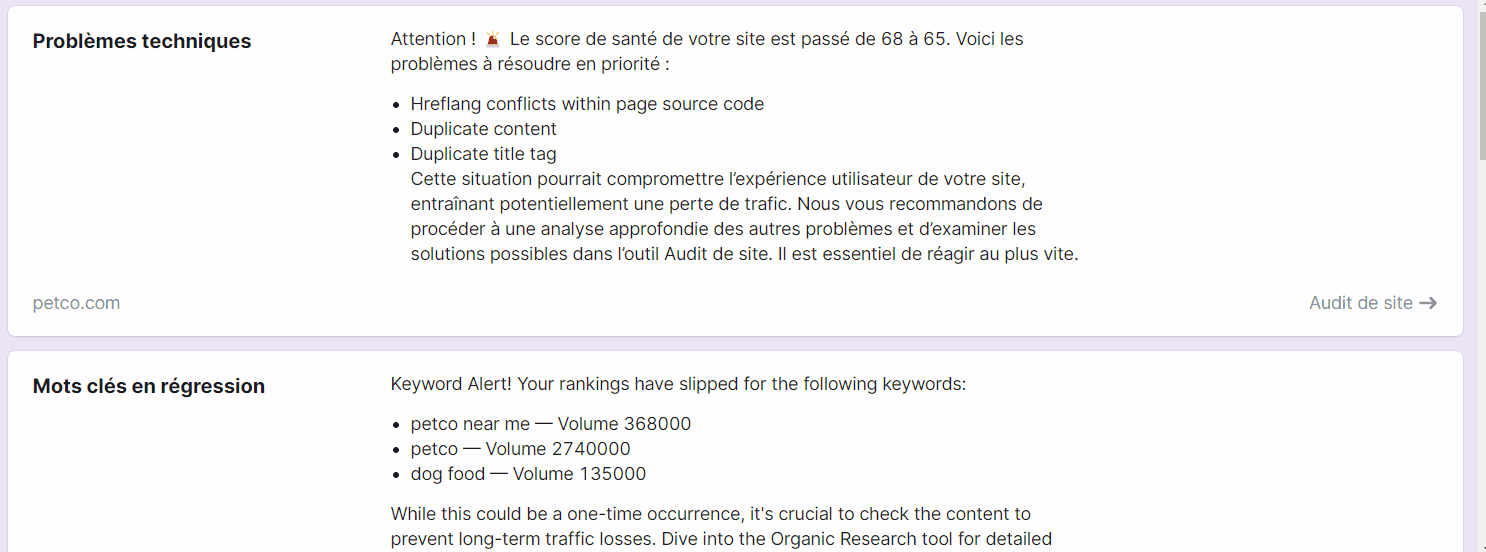• Recommandations d'outils personnalisées : Obtenez des recommandations sur les outils Semrush à utiliser pour améliorer au mieux vos sites web.