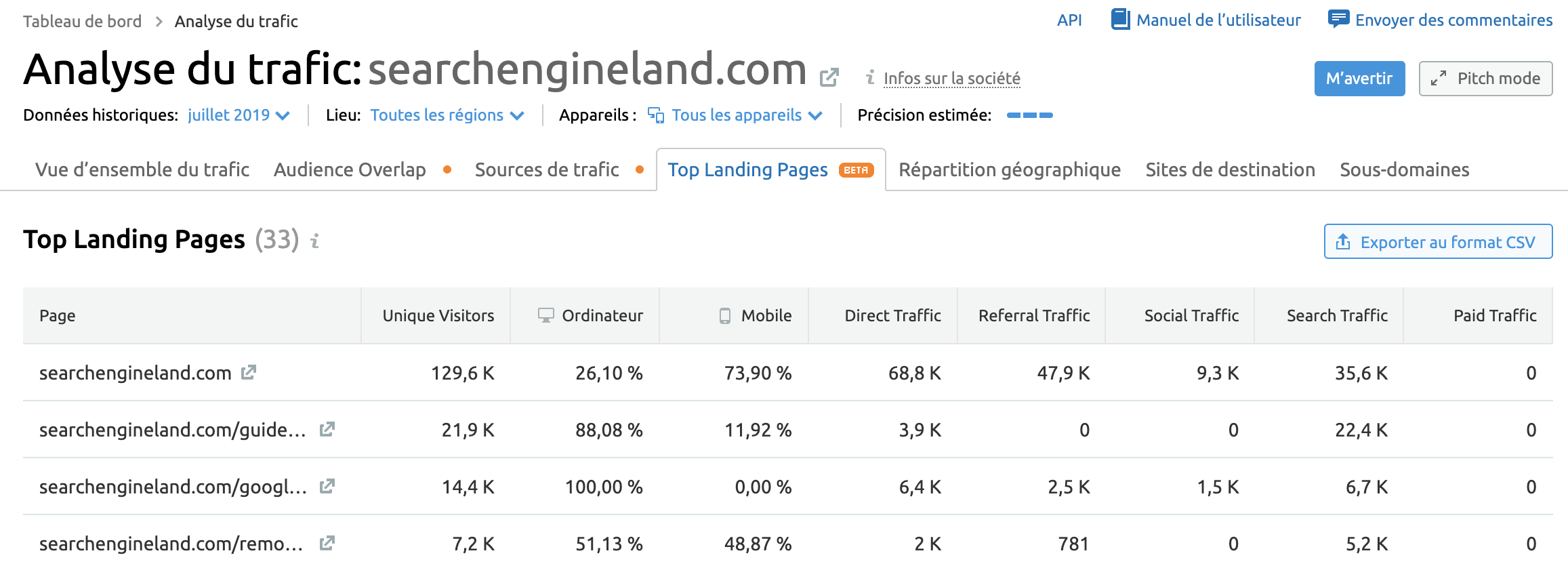 3. Déterminez quels canaux apportent du trafic aux meilleures pages de destination de vos concurrents. Selon la répartition, vous pourrez décider si ce sont les textes d’annonces ou le contenu SEO qui a d’abord besoin de votre recherche de mots clés.