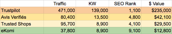 Trustpilot est un leader d’un point de vue SEO. Et de LOIN. Sur la base de l’analyse ci-dessus, Trustpilot est 400% (4 fois) plus puissant que son concurrent le plus proche, et maintient cette avantage depuis plusieurs années. Je ne vois pas comment l’un des autres concurrents pourrait dépasser Trustpilot dans le court ou moyen terme.