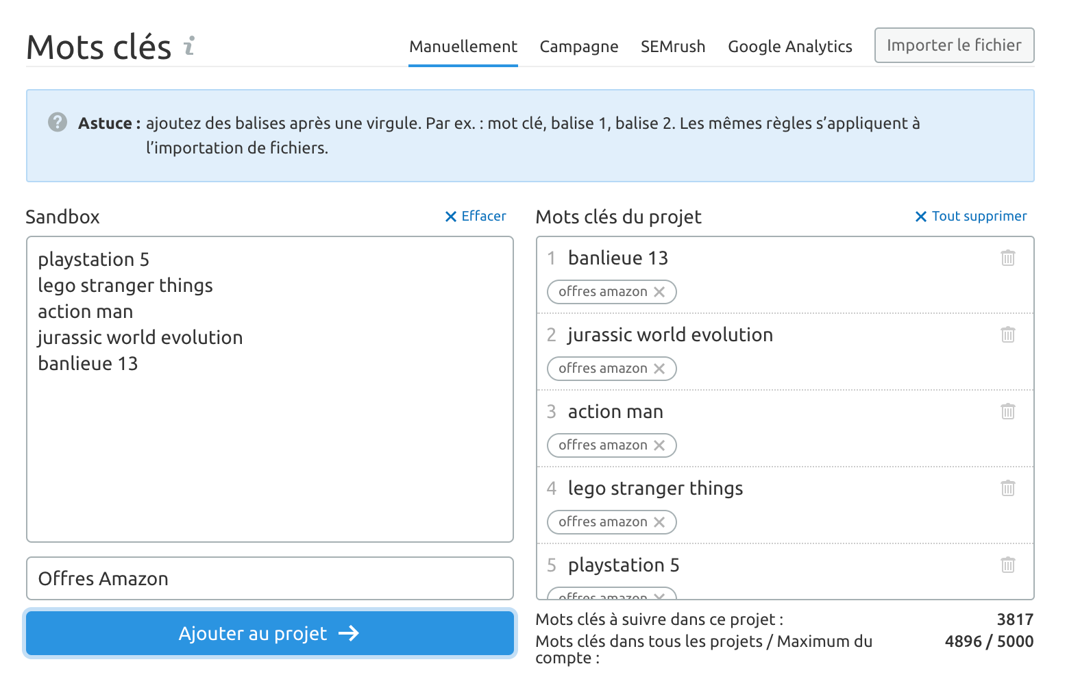 Imaginons que nous travaillons sur le référencement d'un magasin en ligne qui vend des équipements sportifs, des vêtements, et propose un grand assortiment de marchandises. Dans ce cas précis, nous allons suivre des milliers de mots clés pour diverses catégories de produits, divers lieux, occasions saisonnières, sexes, âges et couleurs.