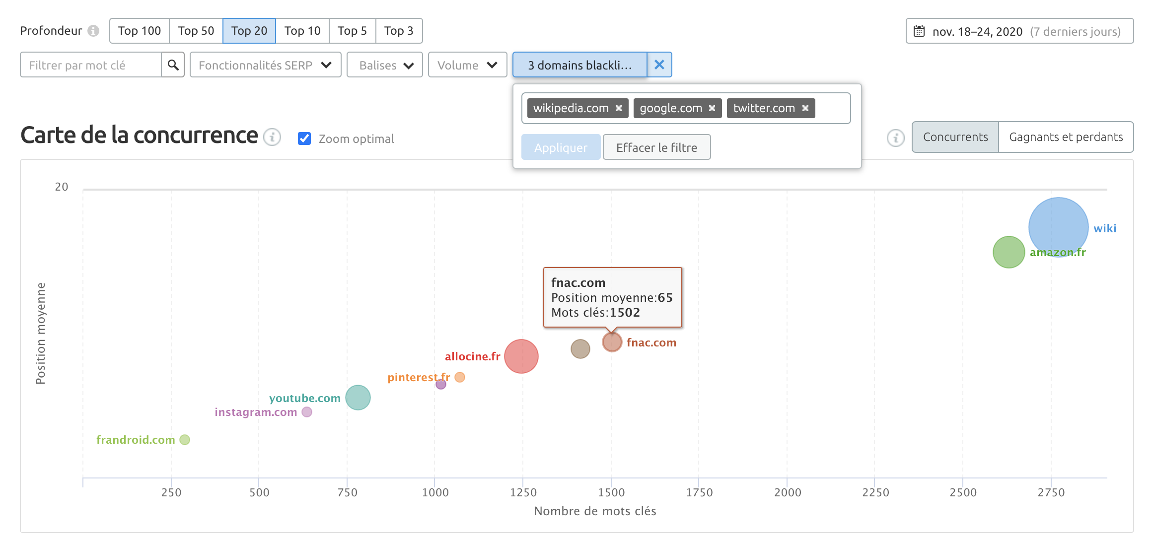 La partie de cet outil consacrée au suivi des concurrents vous permet de voir jusqu'à 20 concurrents dans un tableau à la fois.