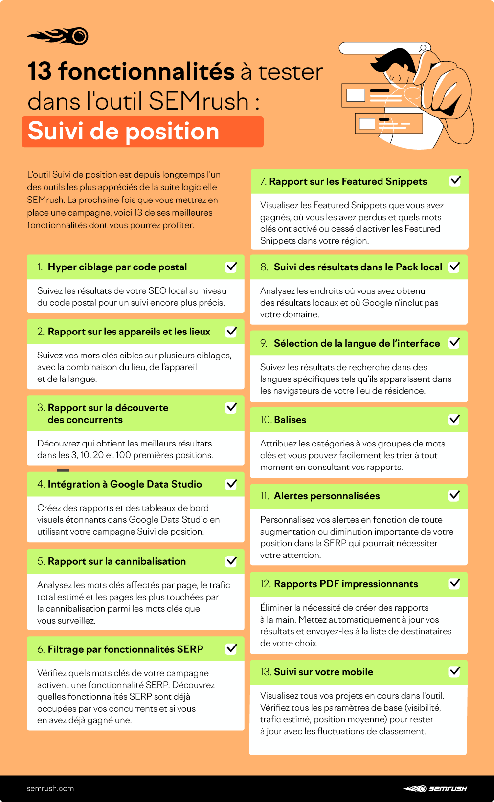 L'outil Suivi de position est depuis longtemps l'un des outils les plus appréciés de la suite logicielle SEMrush. Il vous permet de suivre les SERP et la façon dont vous vous y classez, y compris les fonctionnalités SERP. Avec ce traqueur SEO, vous pouvez surveiller des géolocalisations et des types d'appareils spécifiques, trier les résultats du suivi et les statistiques en utilisant divers paramètres et filtres, repérer les problèmes de cannibalisation, comparer vos performances SEO à celles de vos concurrents et exporter des rapports SEO.