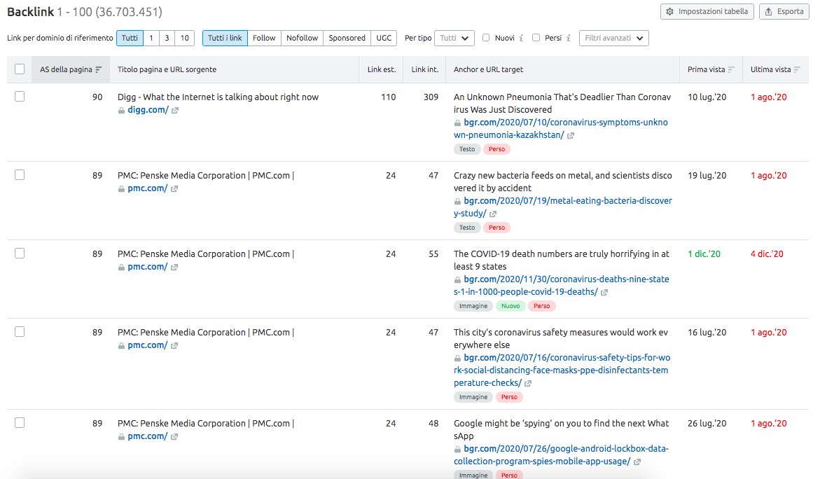 Trova queste pagine usando lo strumento Analisi backlink di SEMrush.