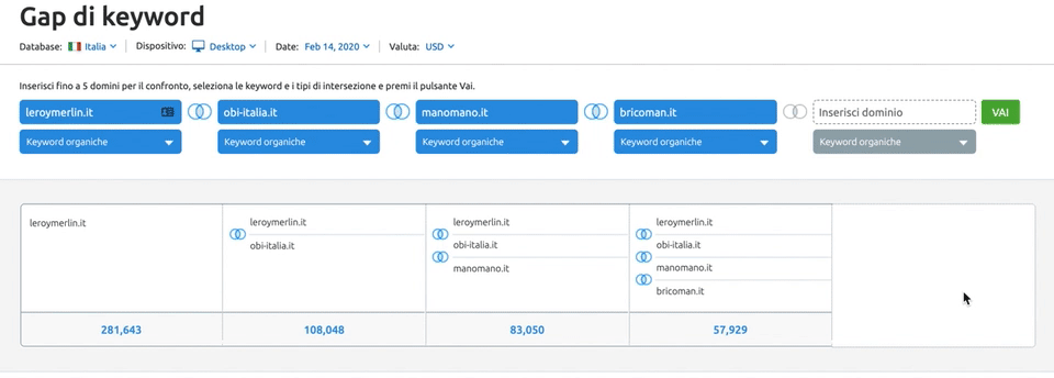 Migliora la tua strategia di content marketing con Gap di keyword. Lo strumento ti consente di confrontare diversi competitor uno di fianco all’altro e vedere tutte le somiglianze e le differenze tra le parole chiave (organiche, a pagamento o PLA) per un massimo di cinque domini concorrenti.