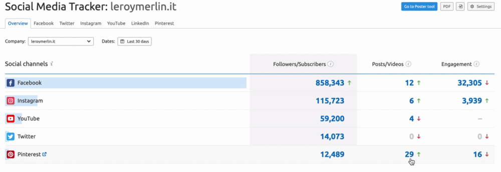 Come puoi notare nello screenshot, mancano due metriche per l'esempio di ricerca di Leroy Merlin: traffico di referral e copertura stimata. Sono disponibili solo quando colleghi Google Analytics o Google Search Console allo strumento. Ciò significa che, una volta terminata l'analisi della concorrenza in Post Tracking, puoi confrontare i risultati con le prestazioni dei tuoi contenuti.