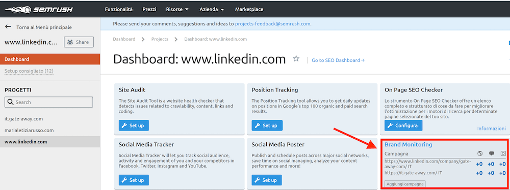 SEMrush può essere utilissimo anche per fare una costante attività di Brand Monitoring per ascoltare chi parla della tua azienda, sia clienti che dipendenti, e poter interagire prontamente grazie a un monitoraggio costante con un solo strumento.