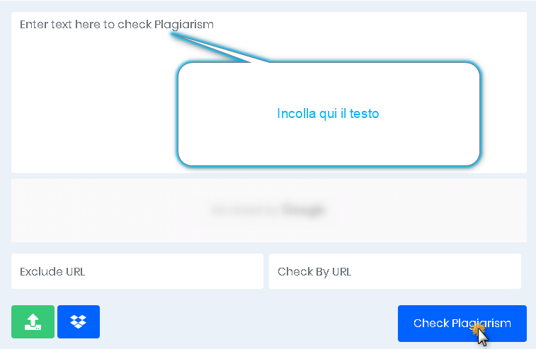 Il primo software (Plagiarism Detector) è gratuito. Ti basta incollare il testo sul campo vuoto (Enter text here to check Plagiarism) o caricare il file del tuo contenuto, aspettare qualche secondo finché il testo non diventa di colore nero, e poi cliccare il pulsante Check Plagiarism.