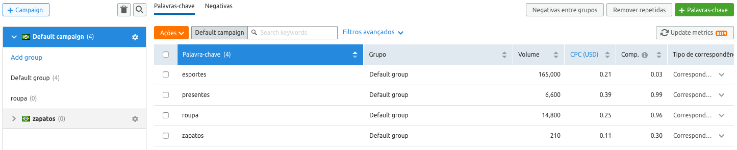 Você poderá planejar grupos de anúncios, gerar automaticamente palavras-chave negativas entre grupos para sua campanha e exportar o plano para um arquivo para que a integração com o Google Ads não tenha problemas.