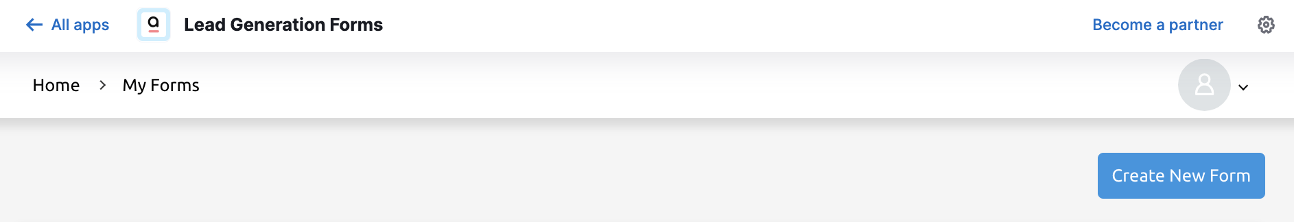 The app’s Home page will house all of the forms you create using Lead Generation Forms. To create one, click the “Create New Form” button on the top right.